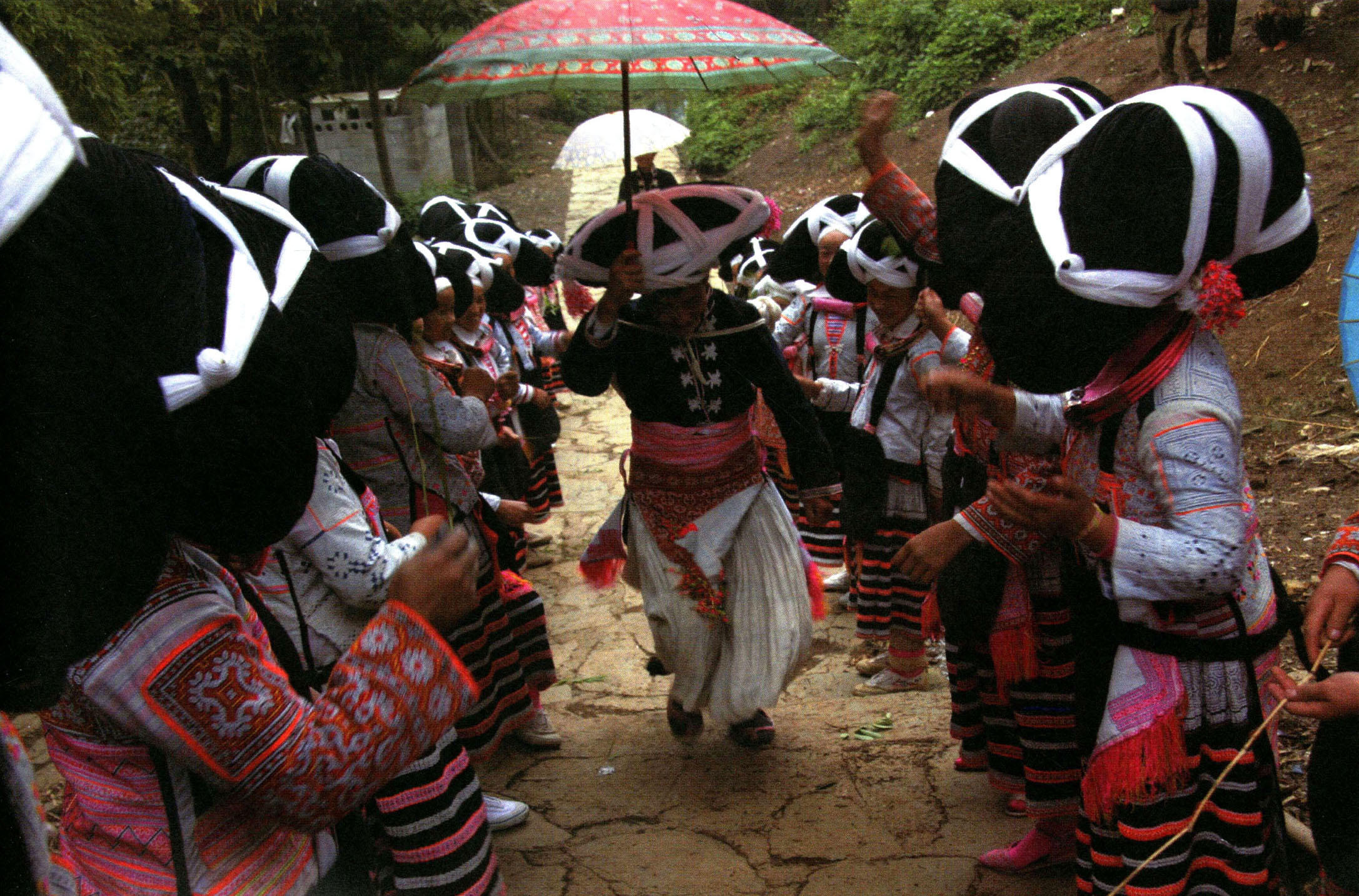 今天的打亲是带有表演性质的,由杨村长的儿子杨兴装扮成求婚的男子。只见杨兴身穿一件崭新的土布对襟上装,上有白色的布纽扣和两个荷包作装饰,背着一只口袋,内装两只鸡(分别为公鸡和母鸡),在媒人的陪伴下来到寨里的女方家。此时,女方家的大门口两边站着十多个姑娘,她们手里拿着竹条“严阵以待”。当满怀喜悦的求婚男子看见这些手拿竹条的姑娘时,心里变得胆怯起来,下意识地往后退了几步,媒人见状便给他鼓劲儿,叫他冲过去。于是,他两手抱头,飞一般地窜过去,但见姑娘们手中的竹条如雨点般地落在了他的身上,打得他哭爹喊娘的,他身上背的两只鸡也被打得“哦哦哦”地直叫唤。旁边看热闹的村民们见状不禁开怀大笑,约翰·杰斯特龙先生也发出了爽朗的笑声。女方家里坐着的都是家亲内戚,他们坐成一个半圆形,全是男性老者,没有老太太。这些老者们嘴里都叼着长烟杆,做出很神气的样子,冲进家门的求婚男子急忙上前给坐在最前面的一位老者跪下,先叩首三次,然后再递上一支香烟,点上火。这位老者也不讲话,只管抽烟。他是女方的舅爷,俗话说“娘亲舅大”,这是中国自宋代流传下来的传统观念,一切是舅爷说了算。舅爷如果点头,这桩婚事就算搞定了;舅爷要是摇头,求婚的男子就要说几大箩筐的好话,一直求到这位舅爷点头,才算过了这一关。这是调侃求婚男子的难得机会,舅爷可以任意提问题,时常弄得求婚男子张口结舌。
