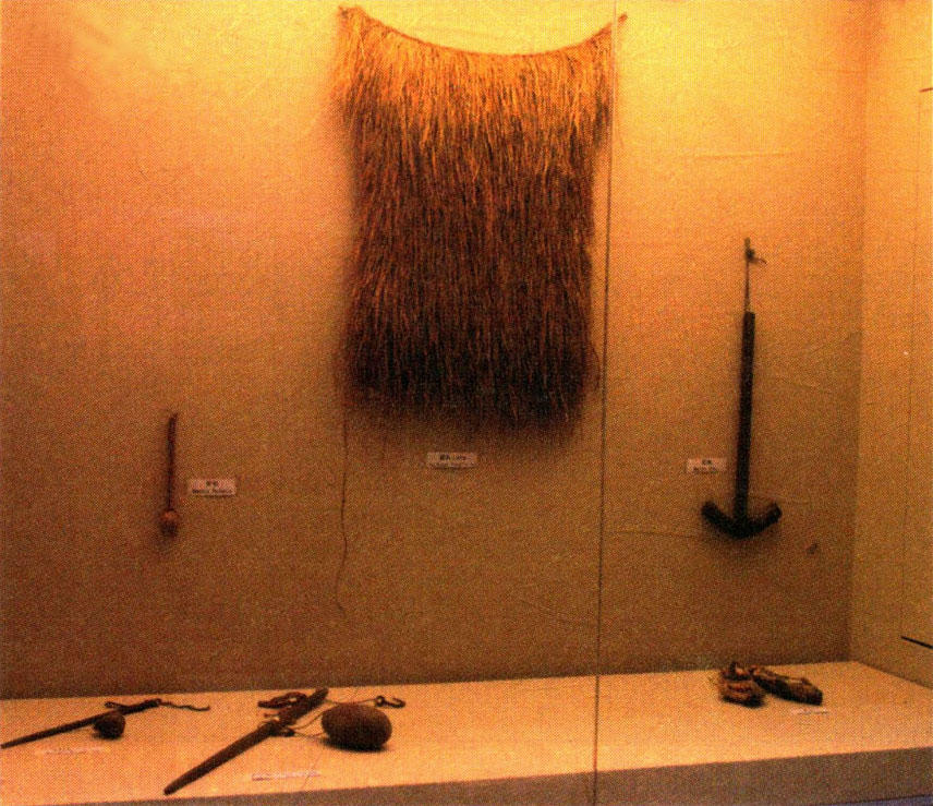 堂屋的右次间是展厅,仅有60平方米,地上未铺地板,抬头即是望板,因此展厅空间显得很大,没有压抑感。墙的四周用五合板围得严严实实,这是为了展览的需要而提前一个月装修的。展厅的展览内容分为四部分:第一部分是生态博物馆产生的背景、生态博物馆的理念,其中有中挪文博专家苏东海和约翰·杰斯特龙先生的照片和简介;第二部分是梭戛社区12个村寨的分布图,包括社区的历史沿革和现实面貌,主要通过图表、照片、文字说明等来解读箐苗的历史;第三部分是箐苗文化,包括生产生活习俗、头饰、服饰、节日歌舞、婚丧嫁娶、祭祀及庆典;第四部分是传统手工工艺品展览,包括体现了箐苗蜡染、刺绣精品的民族服饰,还有铜项圈、羊毛兜肚、绑腿等工艺品。整个陈列有近两百幅照片,实物有服饰、蜡染半成品、刺绣绣片、芦笙、三眼箫和刻竹纪事的竹棍等。