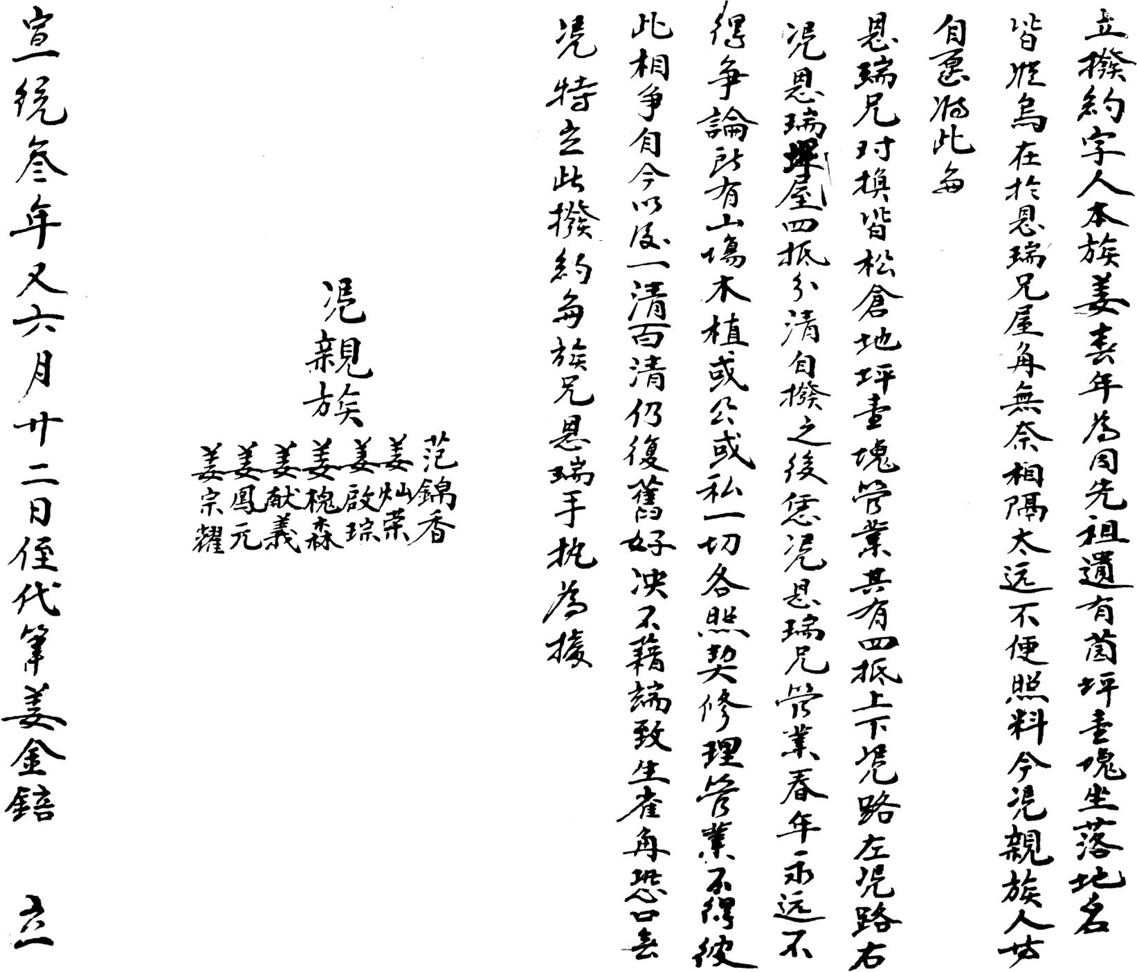 立拨约字人本族姜春年。为因先祖遗有园坪壹块,坐落地名皆从污,在于恩瑞兄屋角,无奈相隔太远,不便照料。今凭亲族人等自愿将此与恩瑞兄对换皆松