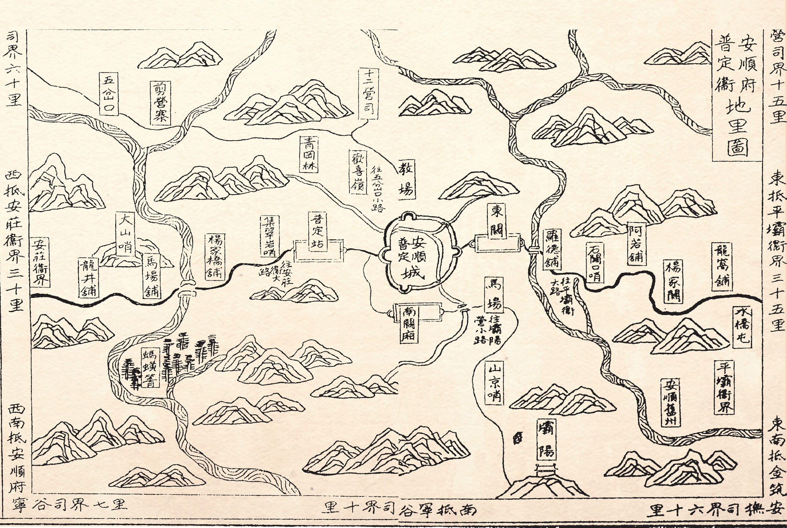 另一幅《安顺府普定卫地理图》同样有极高的史料价值。《黔记》成于万历三十六年(1608年),距安顺州升为安顺军民府(1602年)只有6年,该图是第一次以府、卫同城示人。如图所示,该图仅以府城周边的山川、道路、村寨、关隘描其经纬,对所辖州地未加绘制而是另图单列,尽管如此,对驿道沿线的驿铺均作罗列,各条道路的延伸均有交待,从中可见从明代开始安顺即为“四达之邦”。