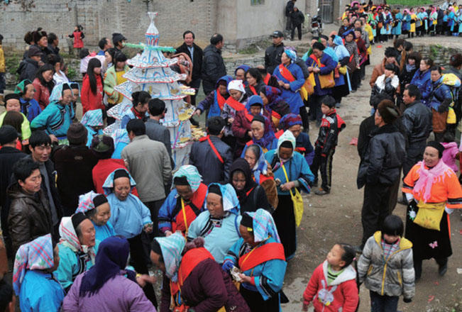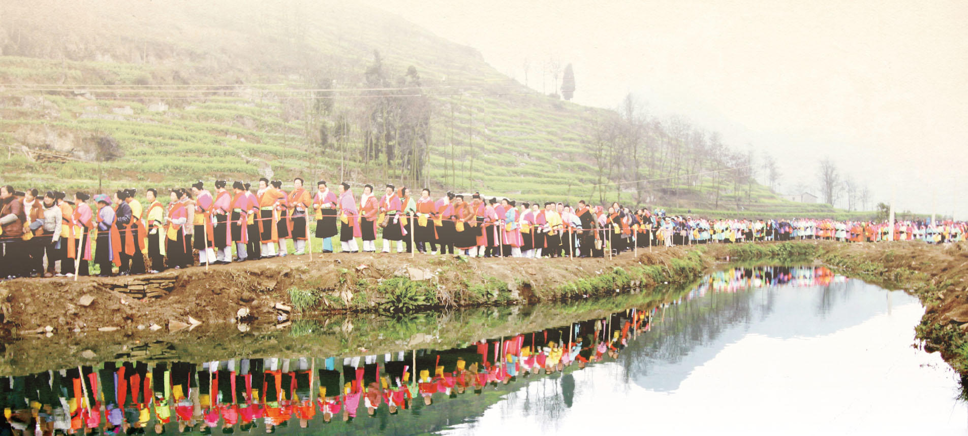 “过河”是屯堡村寨最大的民俗盛会,十二年轮回一次,每年的二月十九,即是龙年,一般逢龙、蛇、鸡年举办一次。屯堡妇女们一生最少要过一次河。这是她们上山门,走回口,朝山拜佛之后修行的一个关卡,过了河她们的修佛才算是真正的功德圆满,修得正果。有罪之人会被打入血河,无罪之人才能顺利走上奈何桥,再过“清河水”清洗,拜年之后可以安然进入极乐世界。