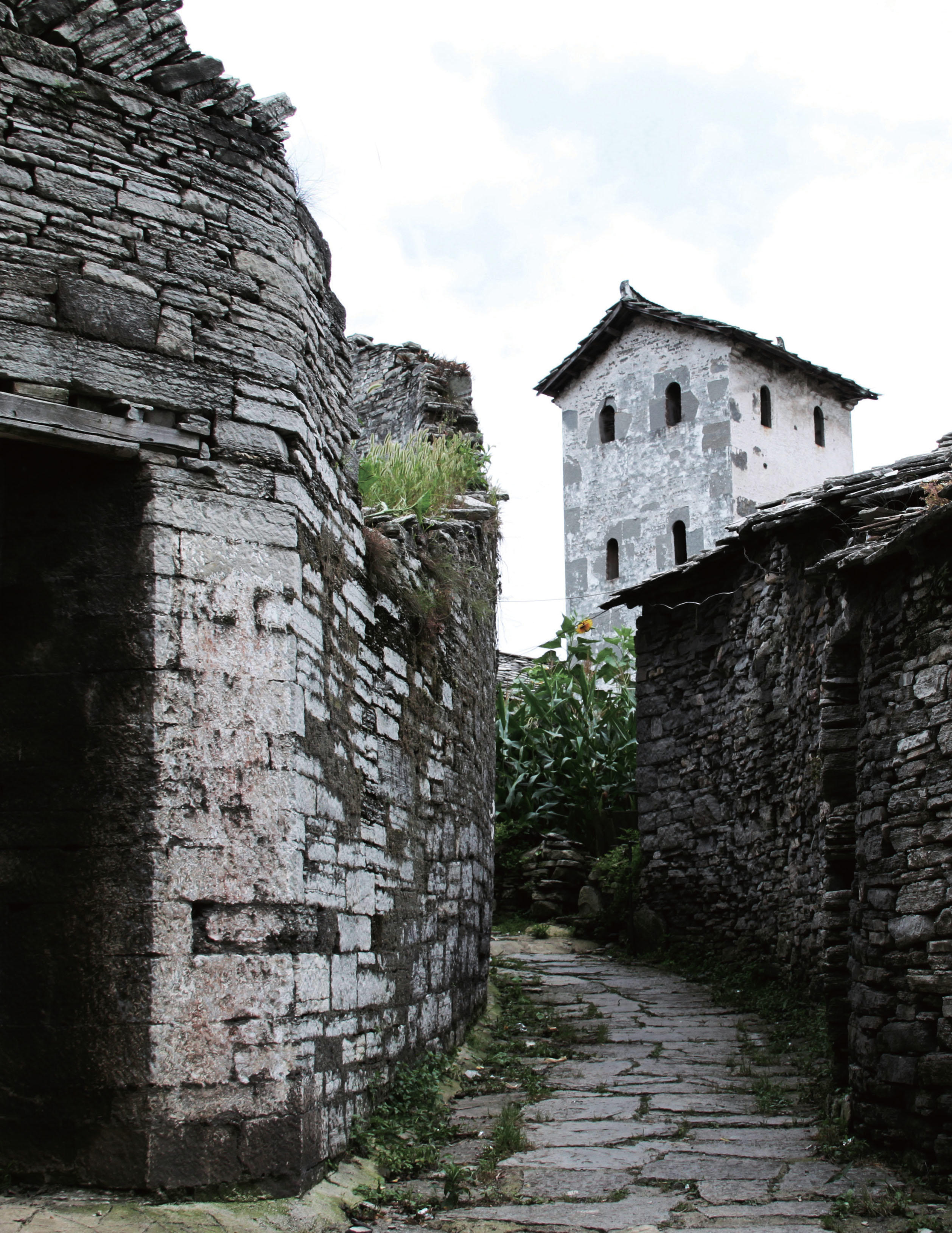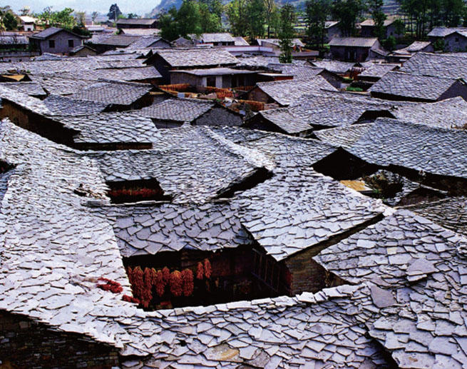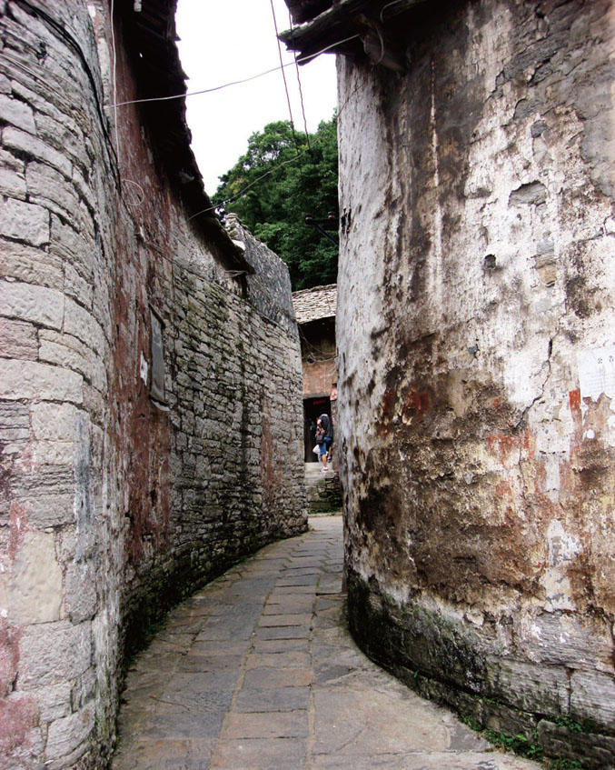在寨外远远望去,就能看到一片石板瓦顶上高耸着七八座碉楼。本寨的四合院建筑比九溪考究,因年代没有九溪那么久远,因而内部结构都还比较完好。钻进窄窄的巷道,穿过一户人家的过厅,天井对面突然耸起一座带有围墙的碉楼,碉楼的炮眼正对门厅。