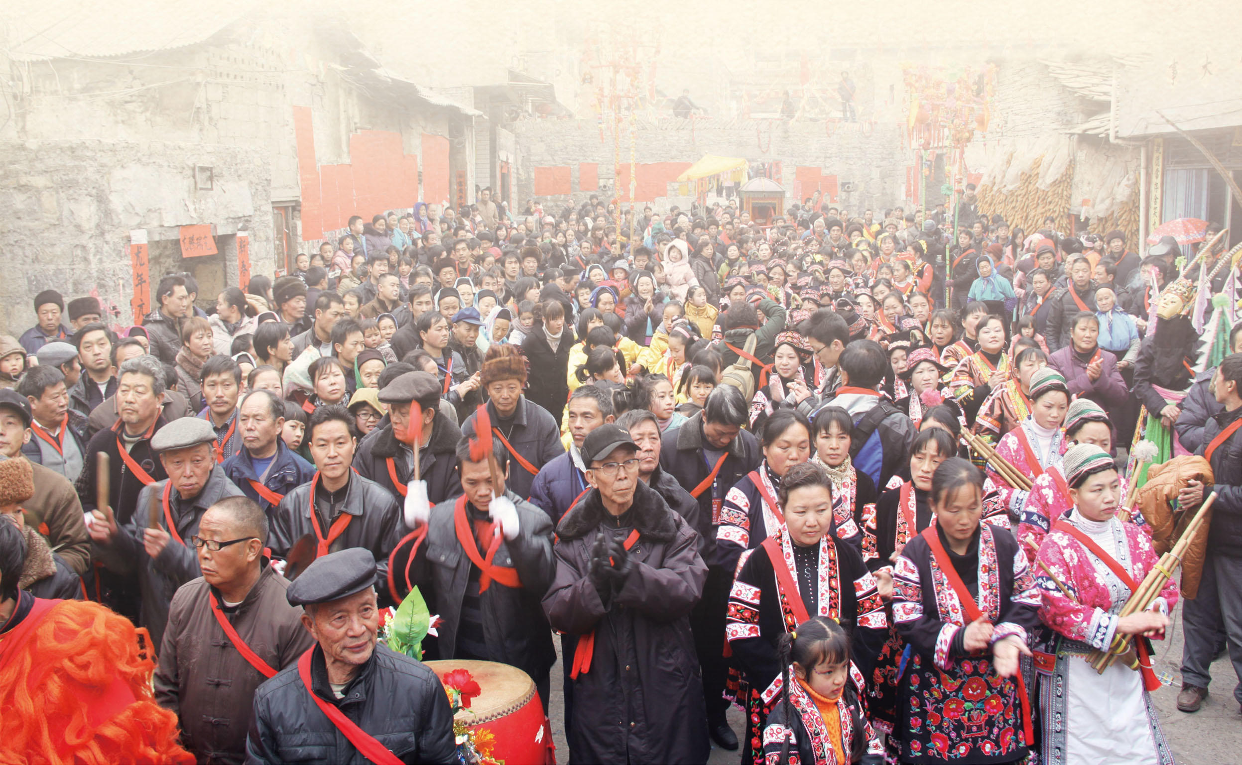 大街小巷、阳台屋顶、村边地头,人头攒动、人流似潮,铁炮声声、地动山摇;锣鼓铿锵、人声沸腾;鞭炮脆响、烟雾缭绕。受屯堡人尊敬的汪公神像端坐在轿中,由龙凤彩旗导引,仪仗队高举肃静、回避牌开道,随后是斧钺、大刀、日月、狮印、葵扇、罗伞及写有越国公爵、微州府主、忠烈汪王的牌子各一块。