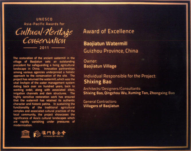 2011年,鲍家屯水碾房整修项目荣获联合国教科文组织亚太遗产保护奖的“卓越奖”。“卓越奖”是亚太遗产保护奖项中的最高奖。2012年10月,鲍家屯古村落已被联合国教科文组织接纳为最佳遗产保护组织的“精英俱乐部”成。