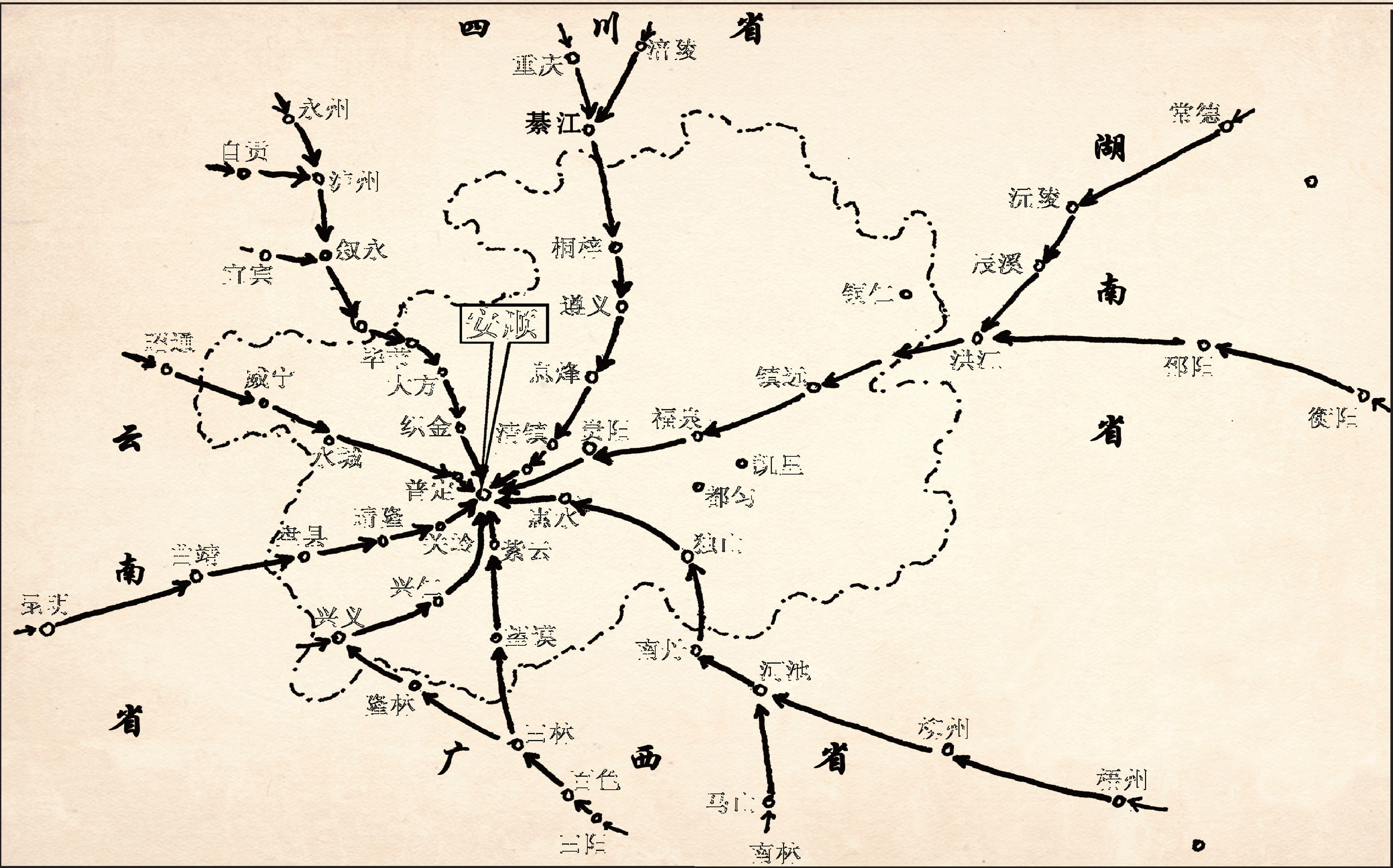 (注: 安顺清末至民国时期外来商贸示意图)