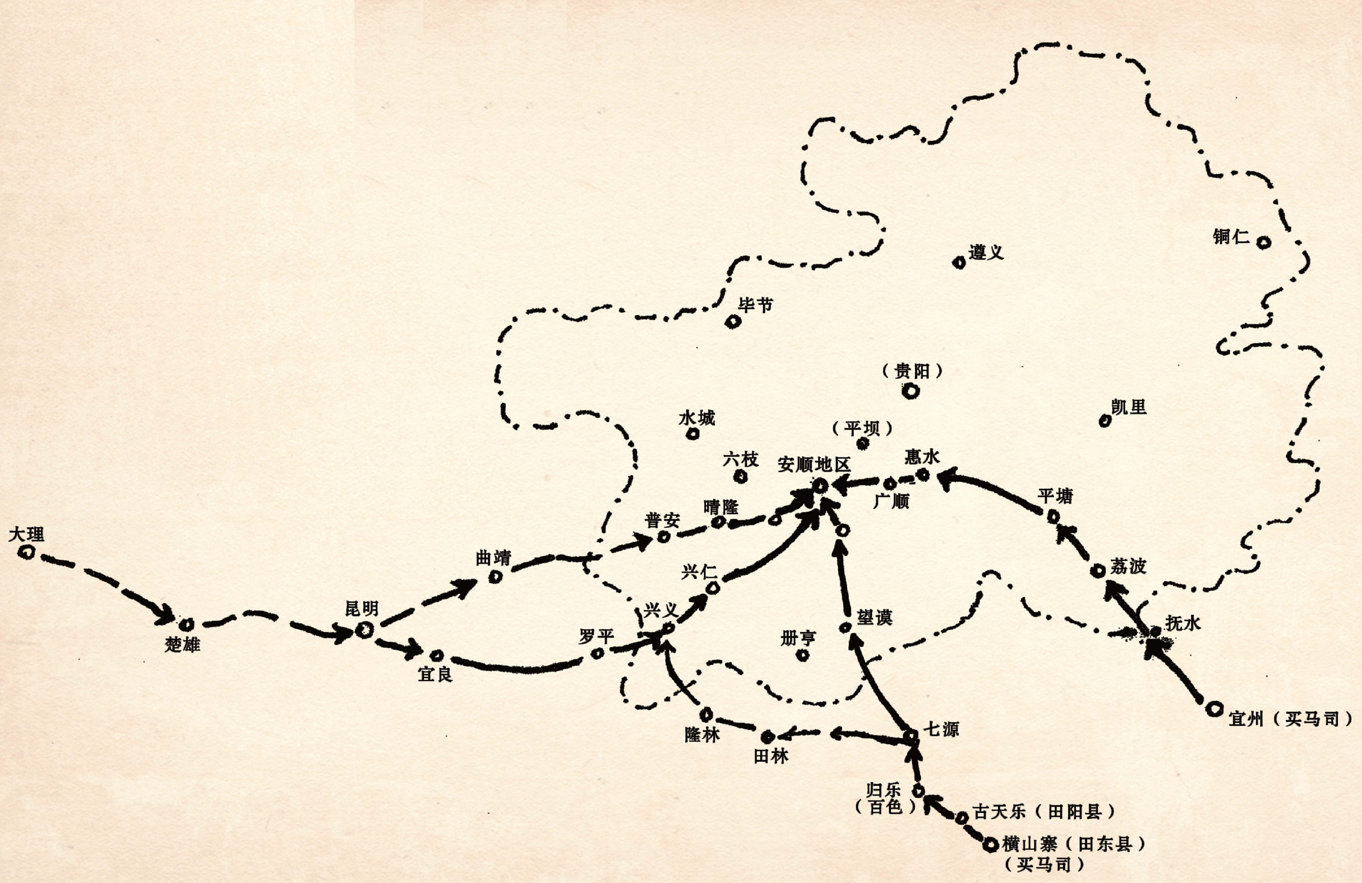 另外,从广西横山寨(今广西田东境)出发达七源州(今百色与凌云间)后,分道从泗城州(凌云县),转向西北,经上展、博文岭、罗扶(册亨一带),入自杞国后,从兴义黄草坝西行可达石城郡(今云南曲靖),然后直通大理(今云南大理)。但交易一般不会在大理国境内直接进行,而是将马贩抵自杞国、罗殿国转手,再经上述第一或第二条路线,分别贩往广西宜州和橫山寨,由朝廷在两处设置的买马司按马匹品相收购。