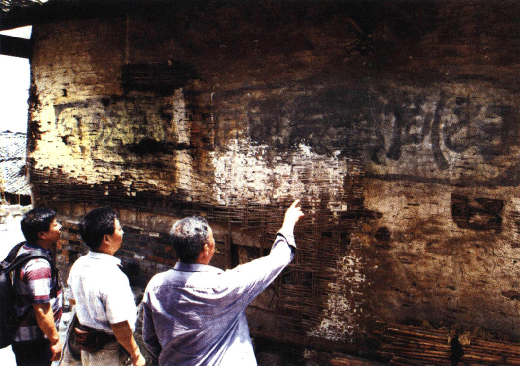 红军过后,寨子里多了许多宣传抗日的标语,这些标语分散在寨子中。马头寨大朝门处朱灿家朝门壁上有一条: