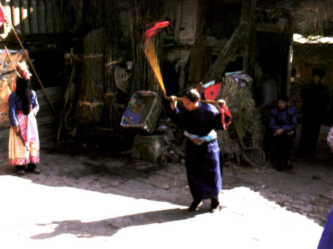 据传,南宋时期,由于朝廷苛刻,江西一带百姓愤起反抗,因无兵器,当时的起义首领徐良将两段长80-90cm的硬质木材,用铁链连接作为兵器和朝廷对抗,当时宋仁宗皇帝派朝廷将领王玉连带兵平反,将义军镇压,并将义军的俘虏押解到今天的贵州。由于王玉连是贫苦出生,也很反对朝廷的做法,对同是平民出生的义军的俘虏很维护,和押解的俘虏很快成了朋友。到达贵州后,王玉连将铁链械在当地广泛传播,后人为纪念王玉连,在跳地戏《王玉连》前都要表演铁链械。据族谱载,在跳地戏《王玉连》前表演铁链械,始于在清光绪末年,每年的正月十五跳地戏前,都要表演铁链械。现仅存于花溪区湖潮乡新民村寅贡村民组的布依族。其动作特征主要是双手转动两根用铁环连接的木棒,使它在头上、肩上、腰上、胯下、背上、或左右侧、背后等处飞快转动。主要动作有:“雪花盖顶”、“颈上飞花”、“苏秦背剑”、"黄龙缠腰”、"古树盘根”、“蛟龙摆尾”、"背上飞龙”、“鱼跳龙门”等等动作。舞动时,显示出“威武、彪悍、沉稳、雄健”的风格。